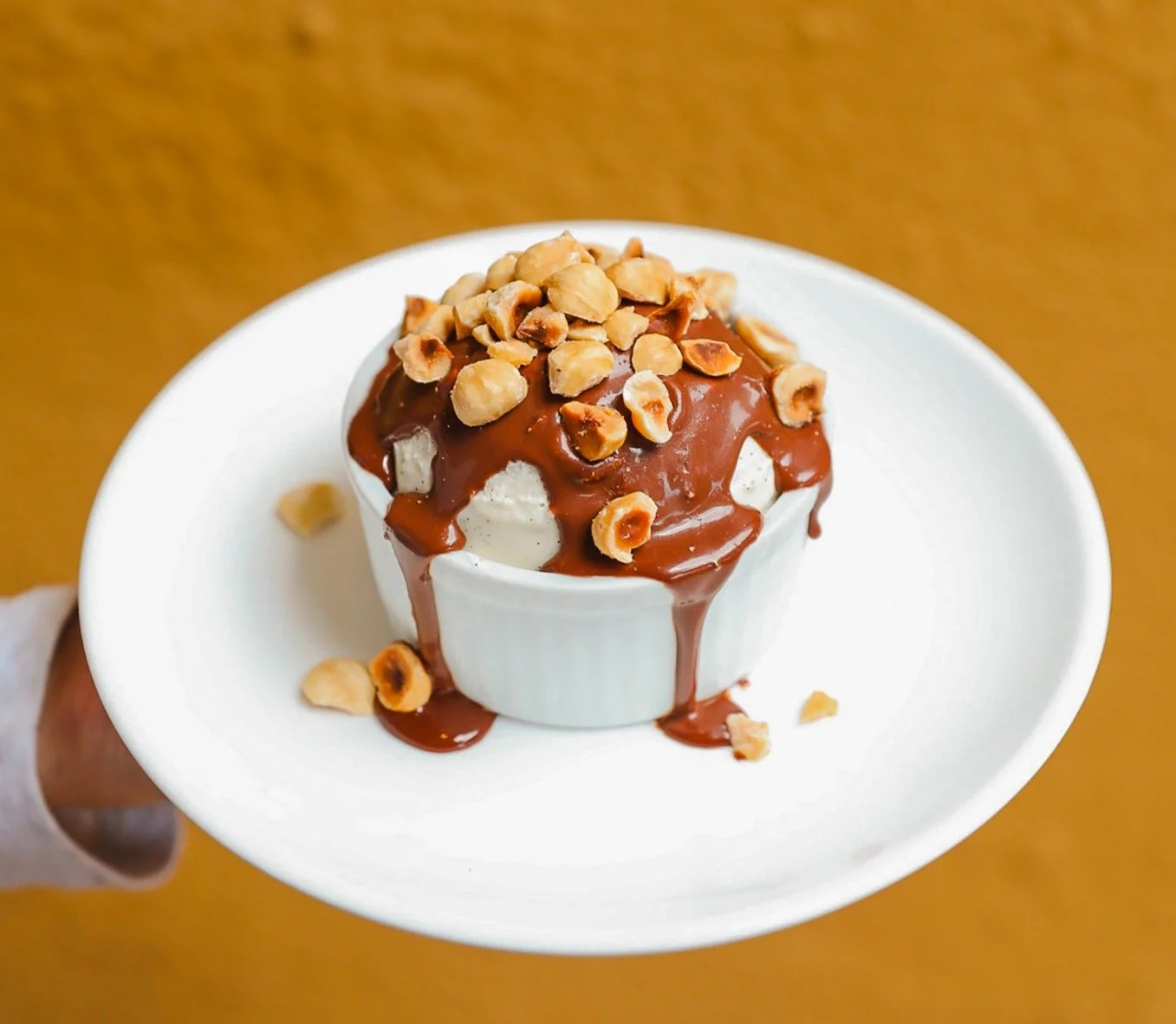 McConnell's vanilla bean and salted caramel chip ice cream, chocolate ganache, toasted hazelnuts (gf)